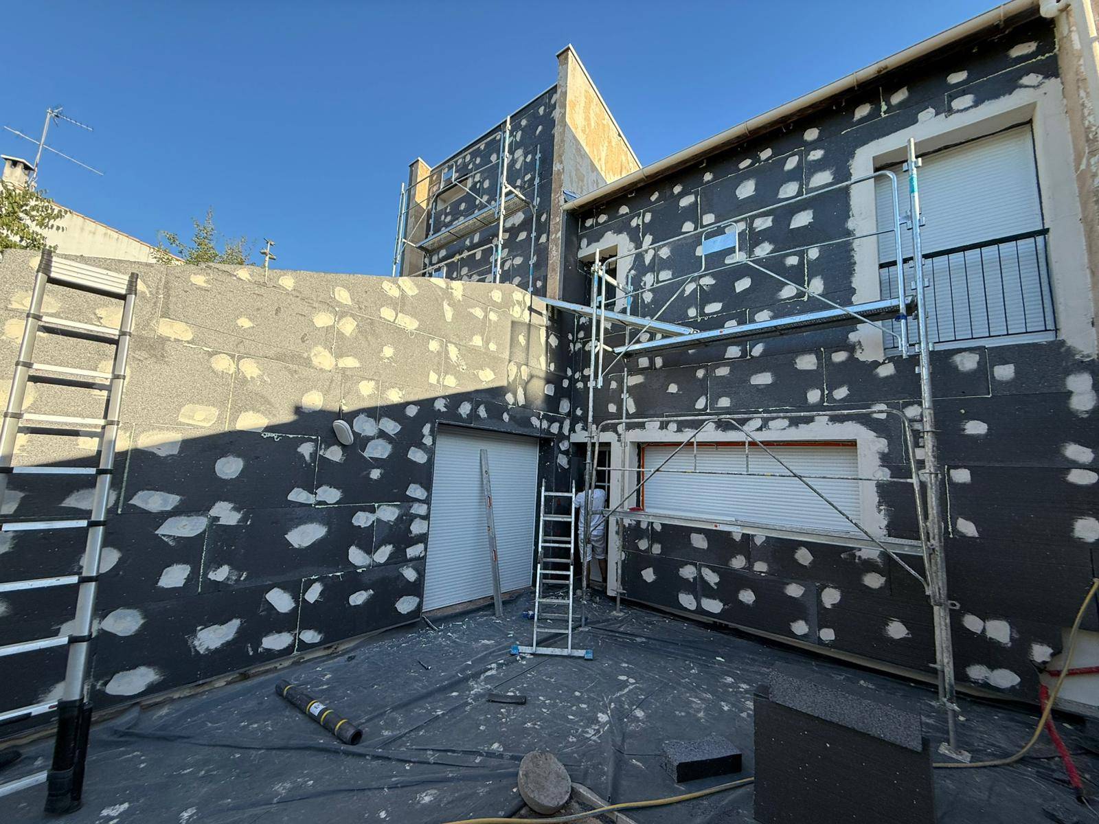Préparation des façades : nettoyage complet des murs, réparation des fissures existantes et traitement des supports pour garantir une parfaite adhérence du système isolant.