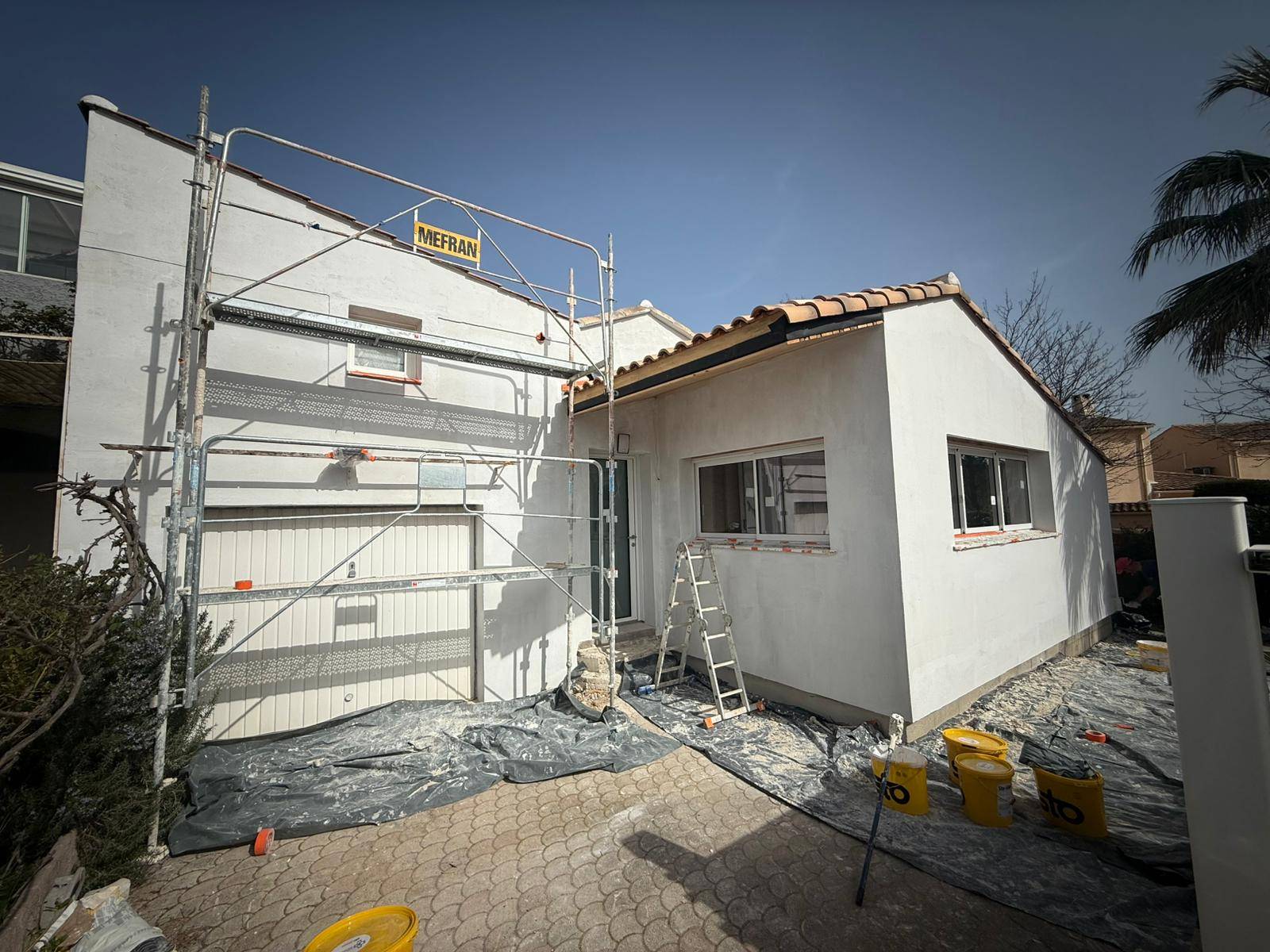 Dans le cadre d'une rénovation extérieure sur une maison individuelle de 75m² à Jacou, près de Montpellier dans l'Hérault, nous avons procédé à la réfection complète des façades avec l'application d'un enduit monocouche semi allégé GF grain ParexLanko.