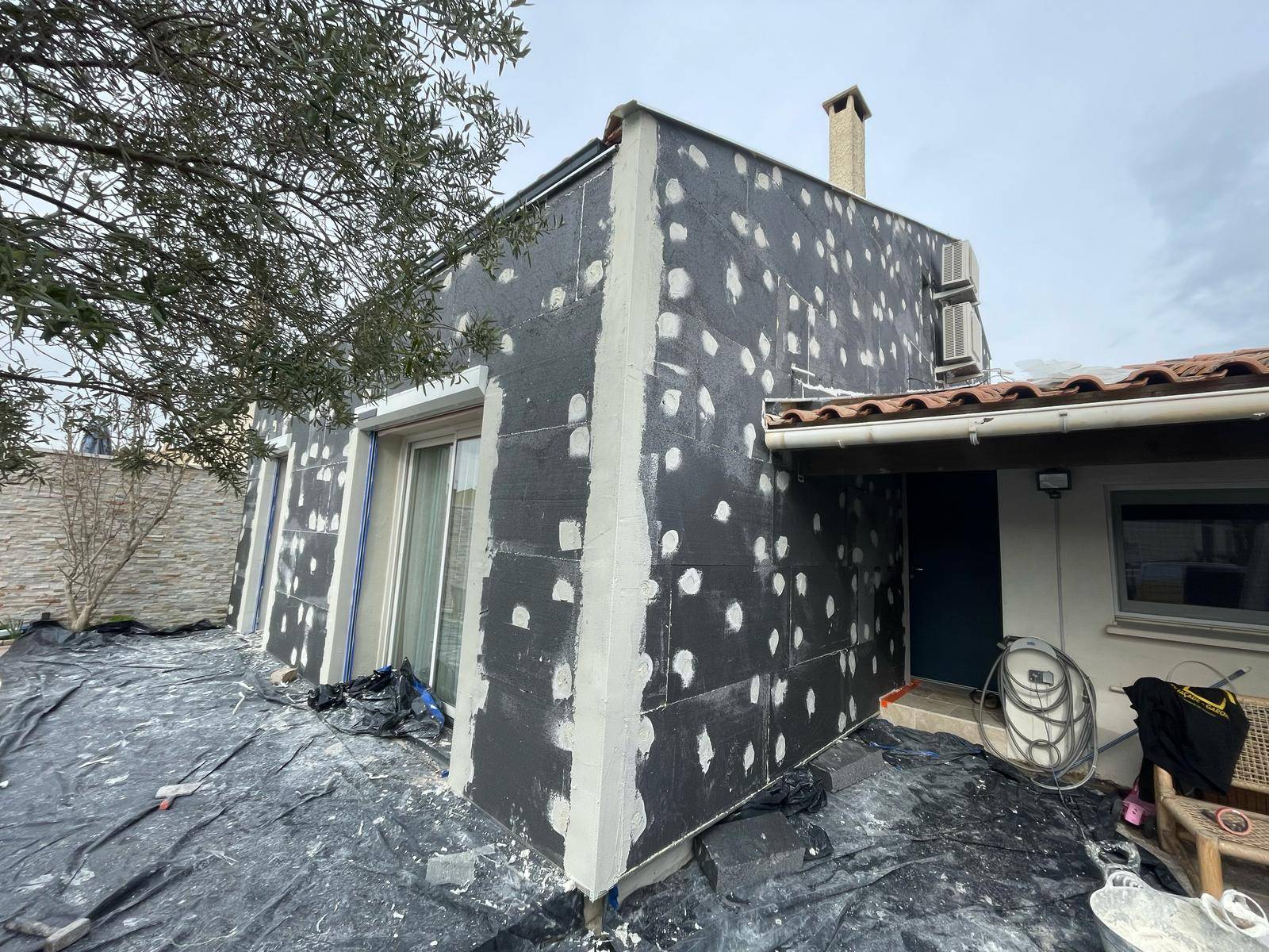 Le revêtement initial de la façade à Lattes était en crépis traditionnel. Après une étude technique précise du support existant et des besoins du client, notre équipe a procédé à la mise en oeuvre de 130m² d'isolation thermique par l'extérieur. Cette intervention a permis d'améliorer significativement la performance énergétique de l'habitation tout en apportant une réelle plus-value esthétique au bâtiment.